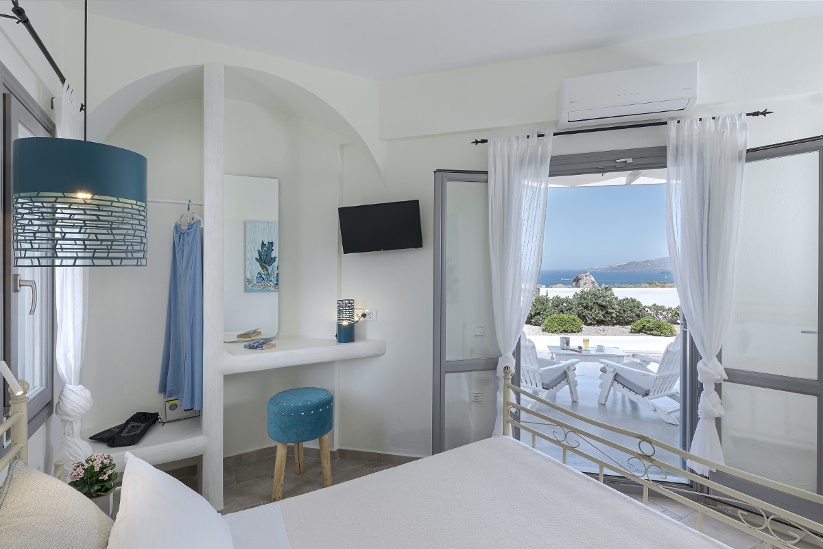 With a hosting capacity of up to 6 persons, it is a self-catering villa with 3 soundproof, non-smoking bedrooms, a WC, and a full-fledged bathroom equipped with free toiletries and various towels, air-conditioning, free wi-fi throughout the estate, and a roomy kitchen with refrigeration and small appliances. Adding to that, a spacious living room with a built-in fireplace is present, as well as flat-screen TVs and a writing desk. The whitewashed verandas and balconies offer a charming variety of island views; from the pristine swimming pool outside the villa and the lovely vineyard on the back of the estate to the azure Aegean Sea and the famous Caldera and Volcano vistas.